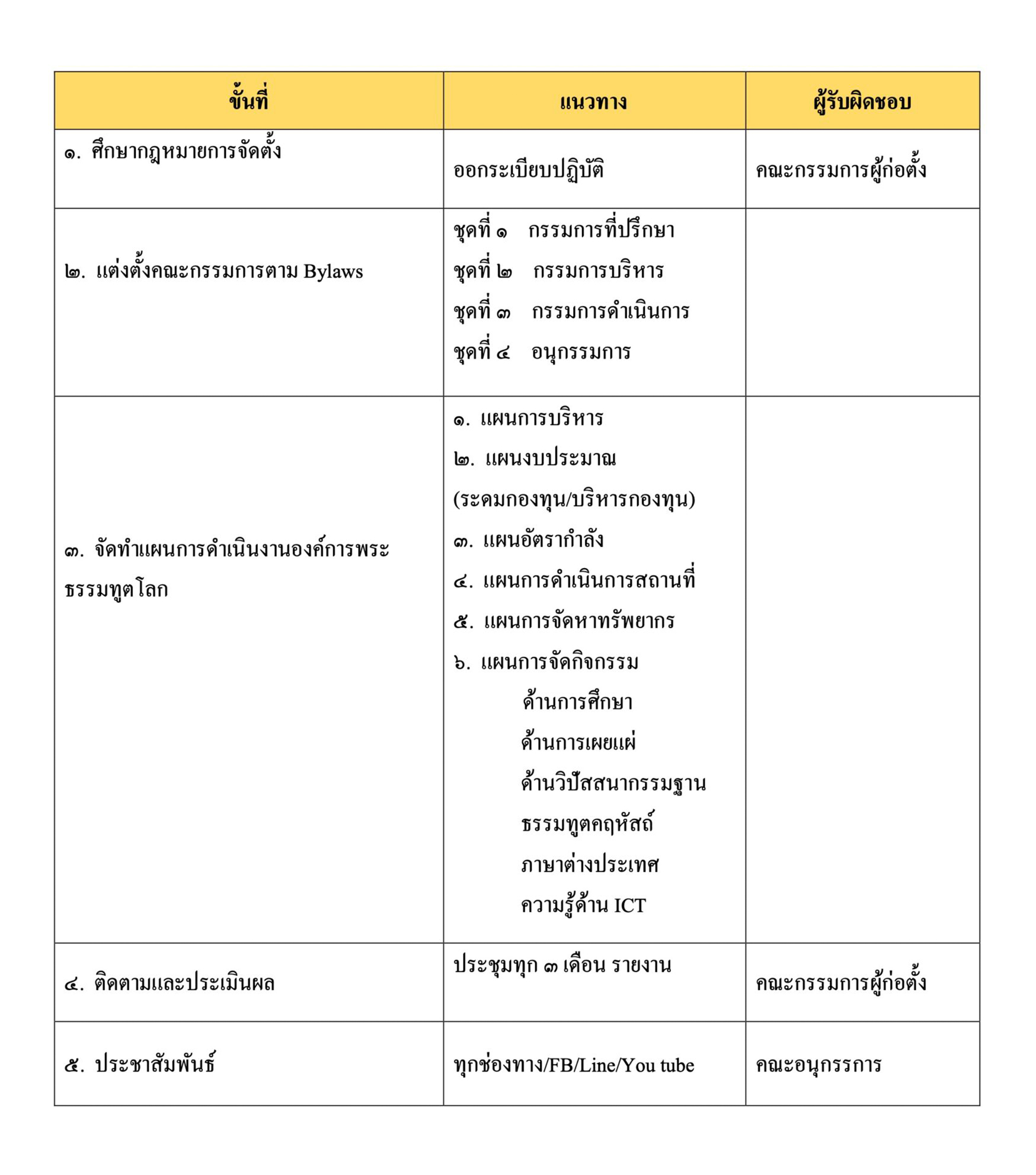 ๗. ขั้นตอนแนวทางการดำเนินการองค์การพระธรรมทูตโลก