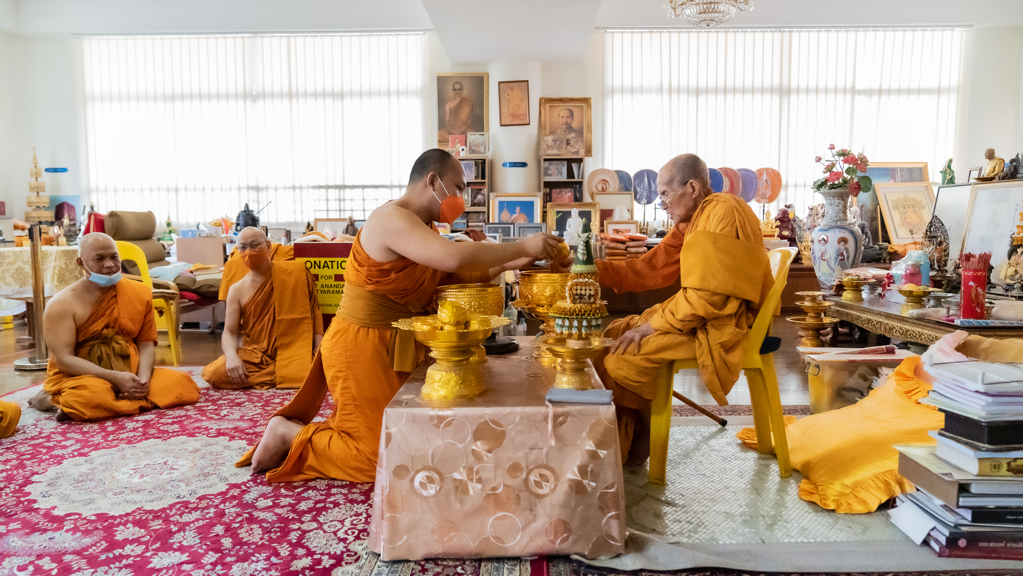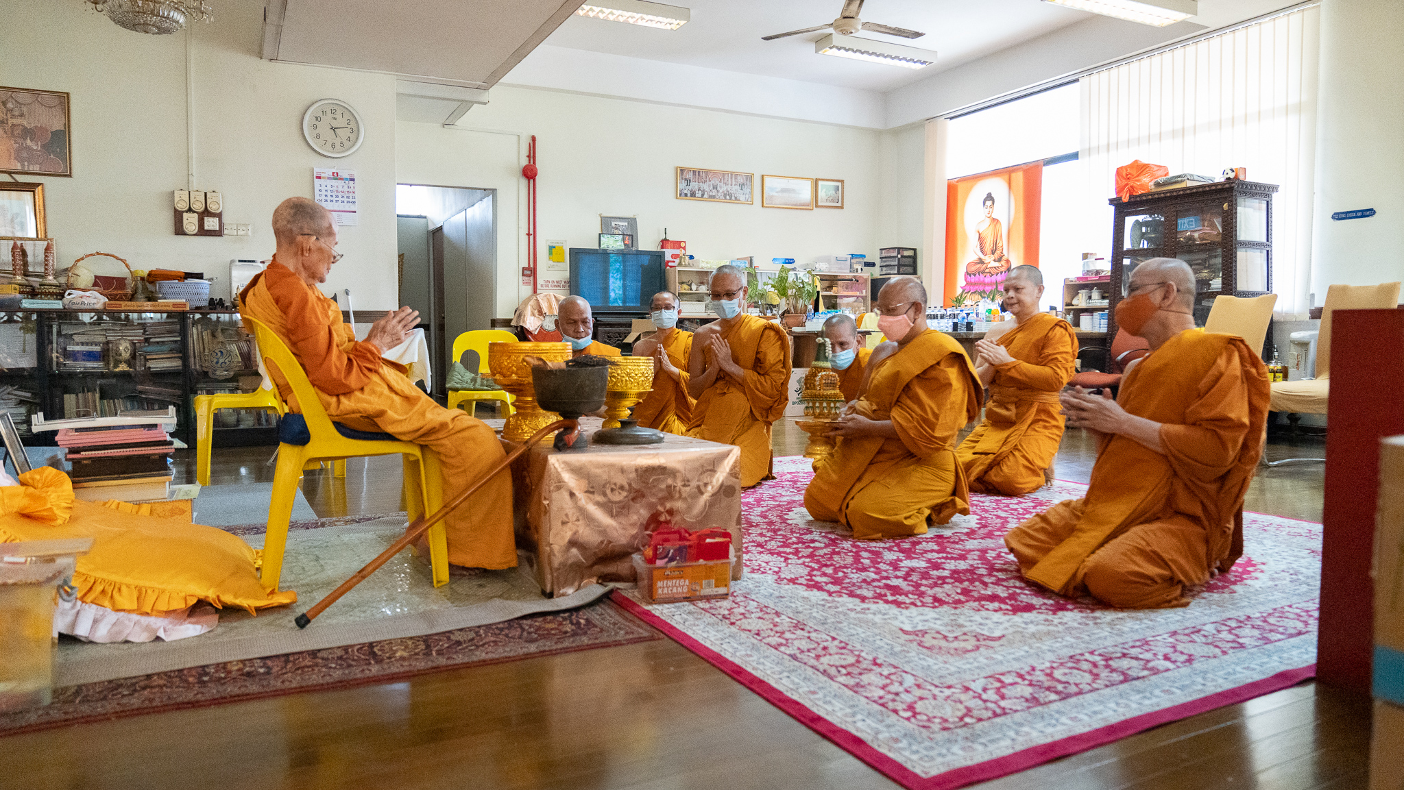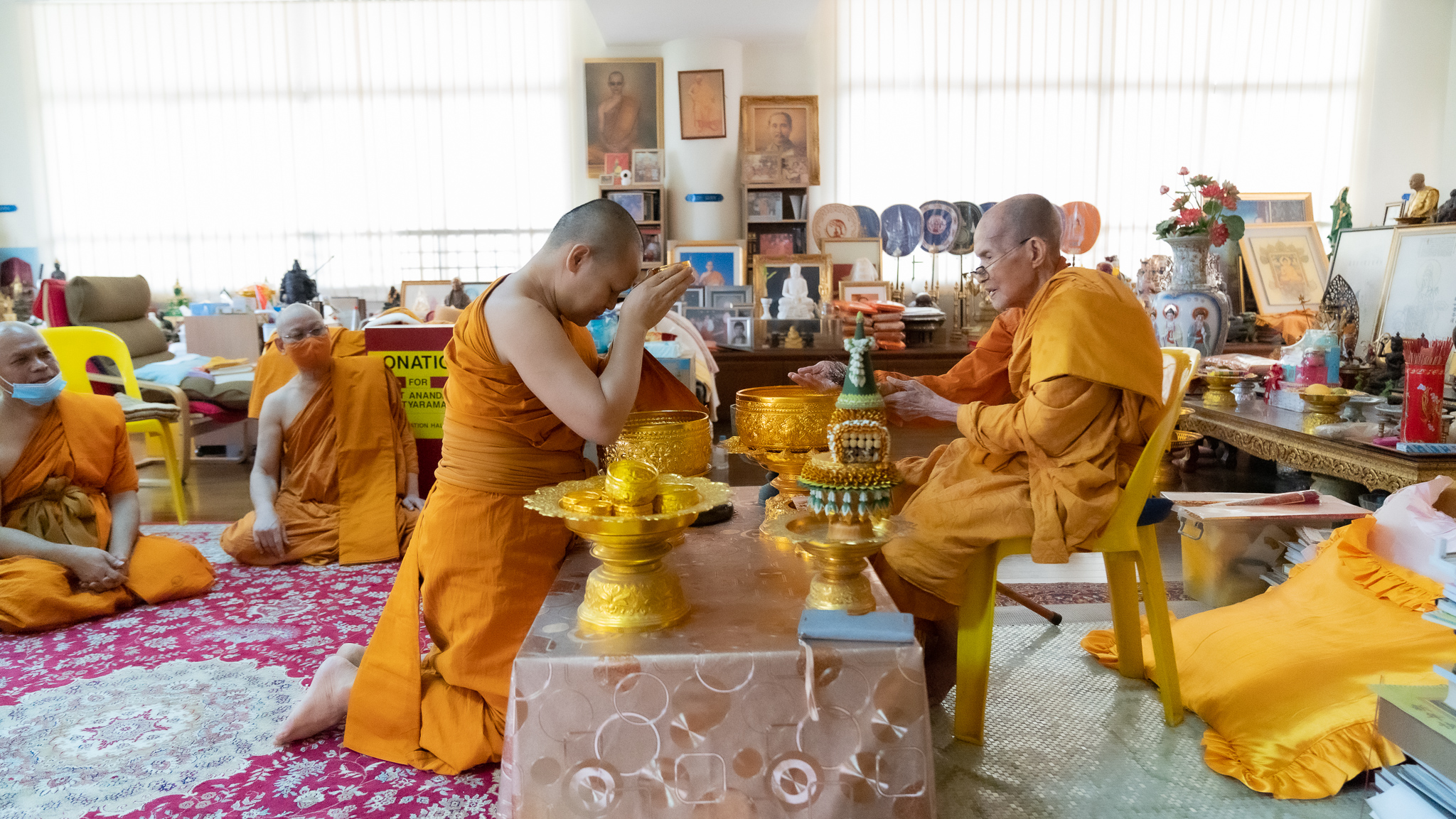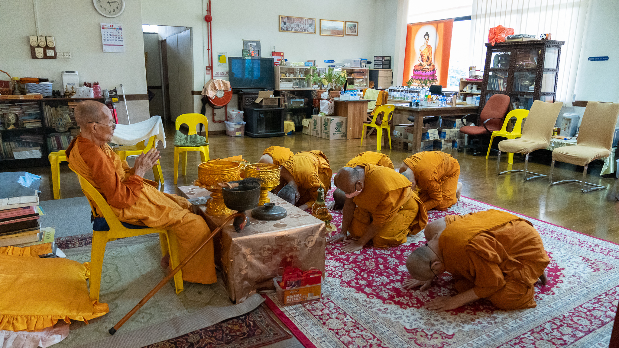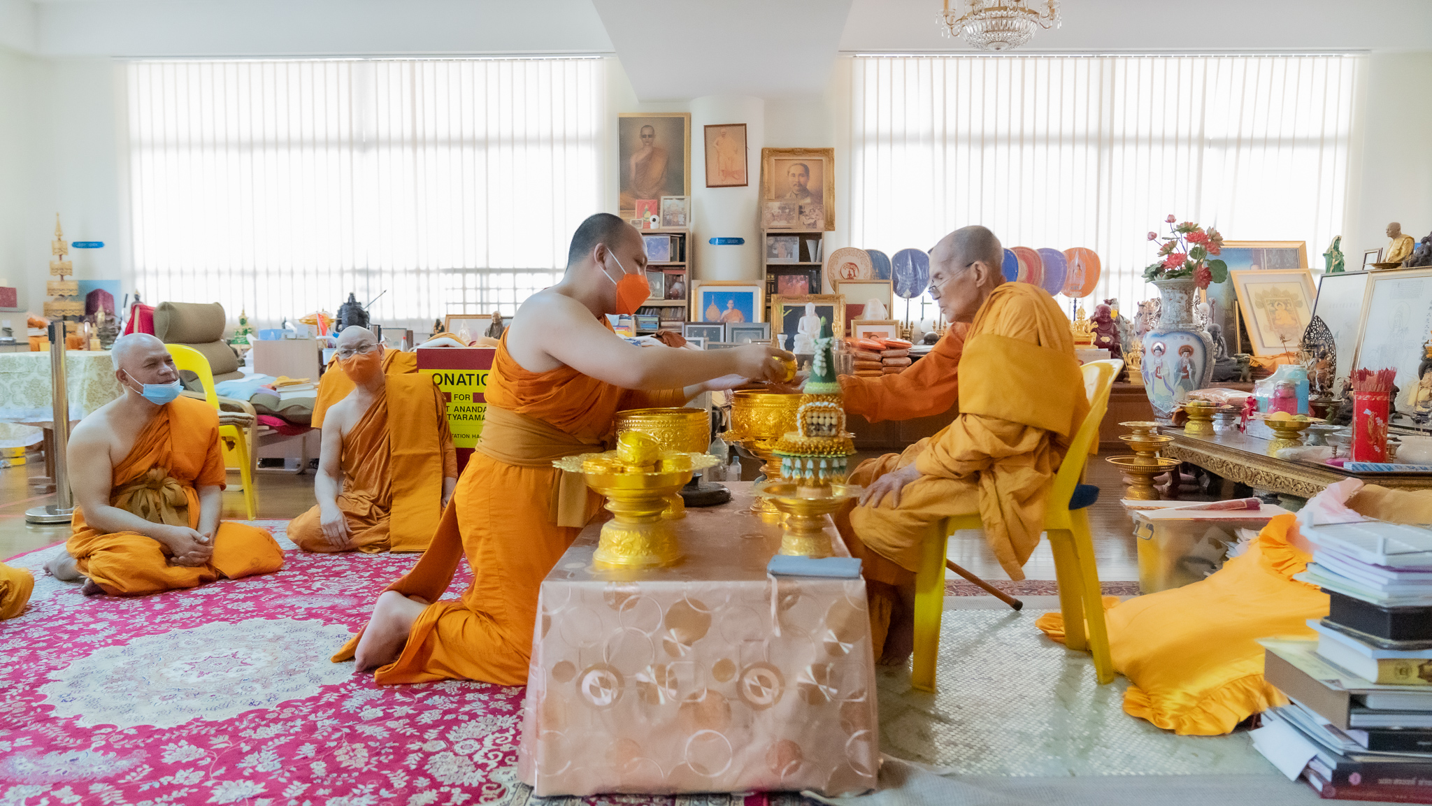 The resident monks of Wat Ananda Metyarama performed an action of showing respect to Most Venerable Luang Phor Chao Khun on special occasion of Songkran Festival Celebration (Thai New Year Celebration) 13 April 2022.