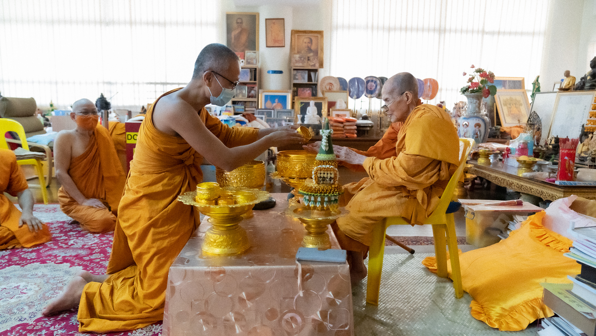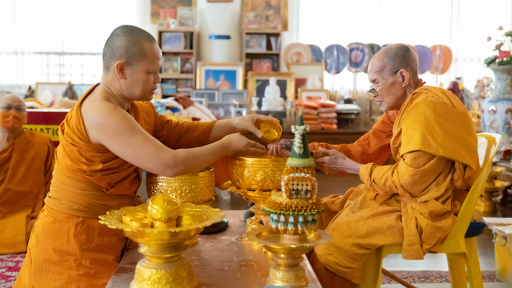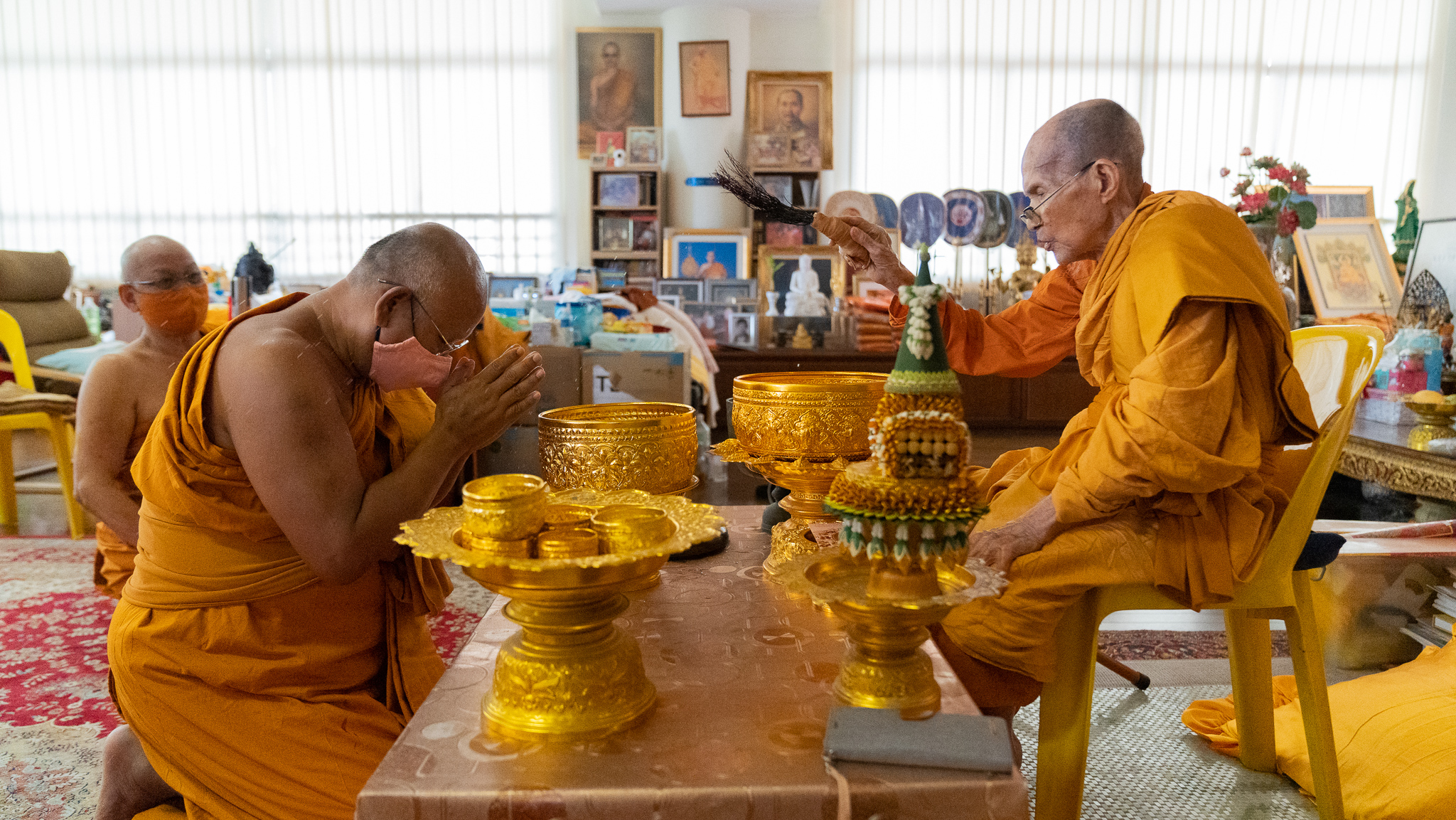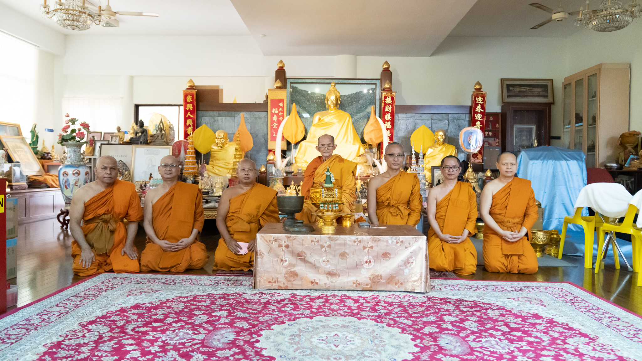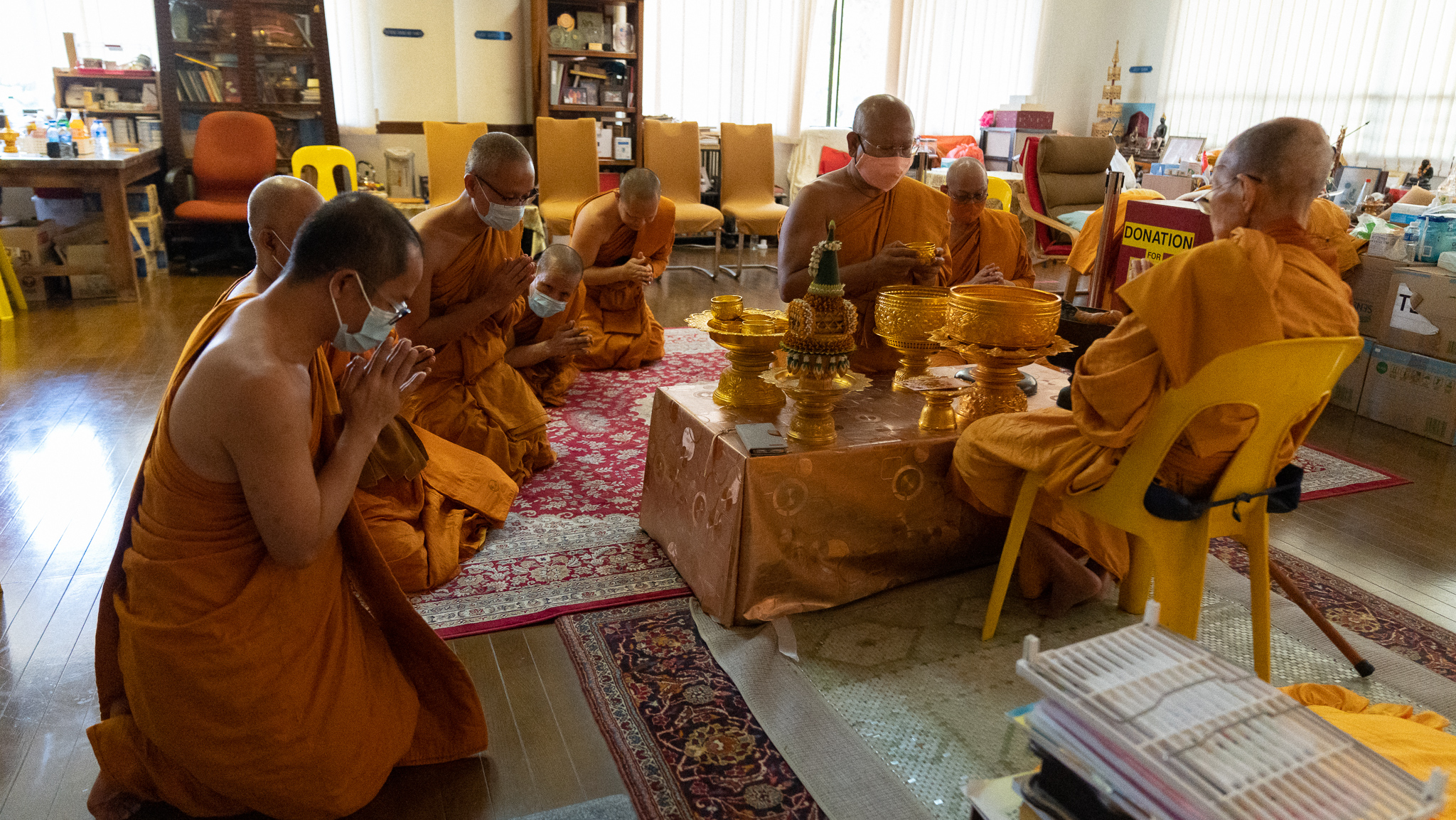 The resident monks of Wat Ananda Metyarama performed an action of showing respect to Most Venerable Luang Phor Chao Khun on special occasion of Songkran Festival Celebration (Thai New Year Celebration) 13 April 2022.