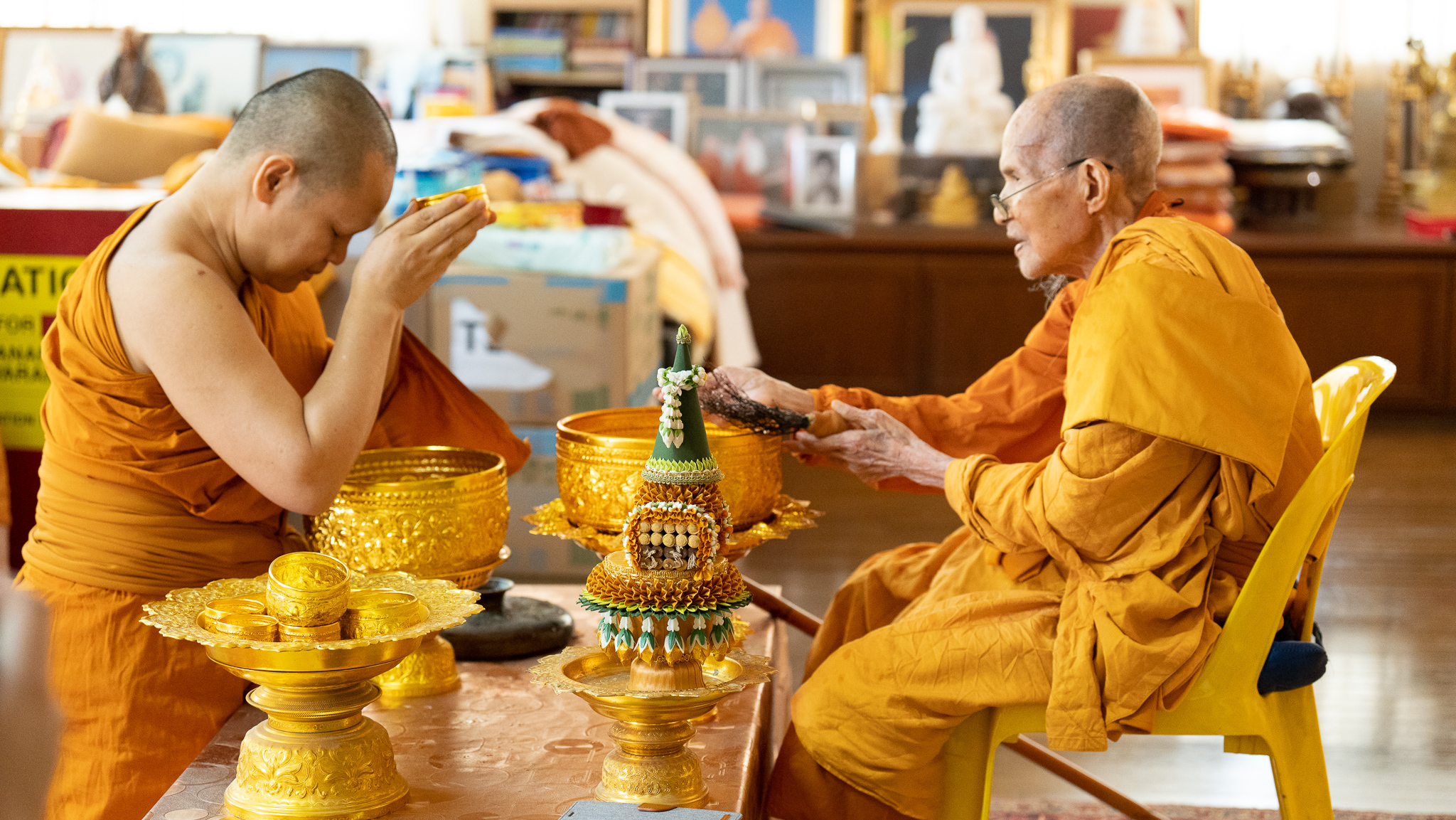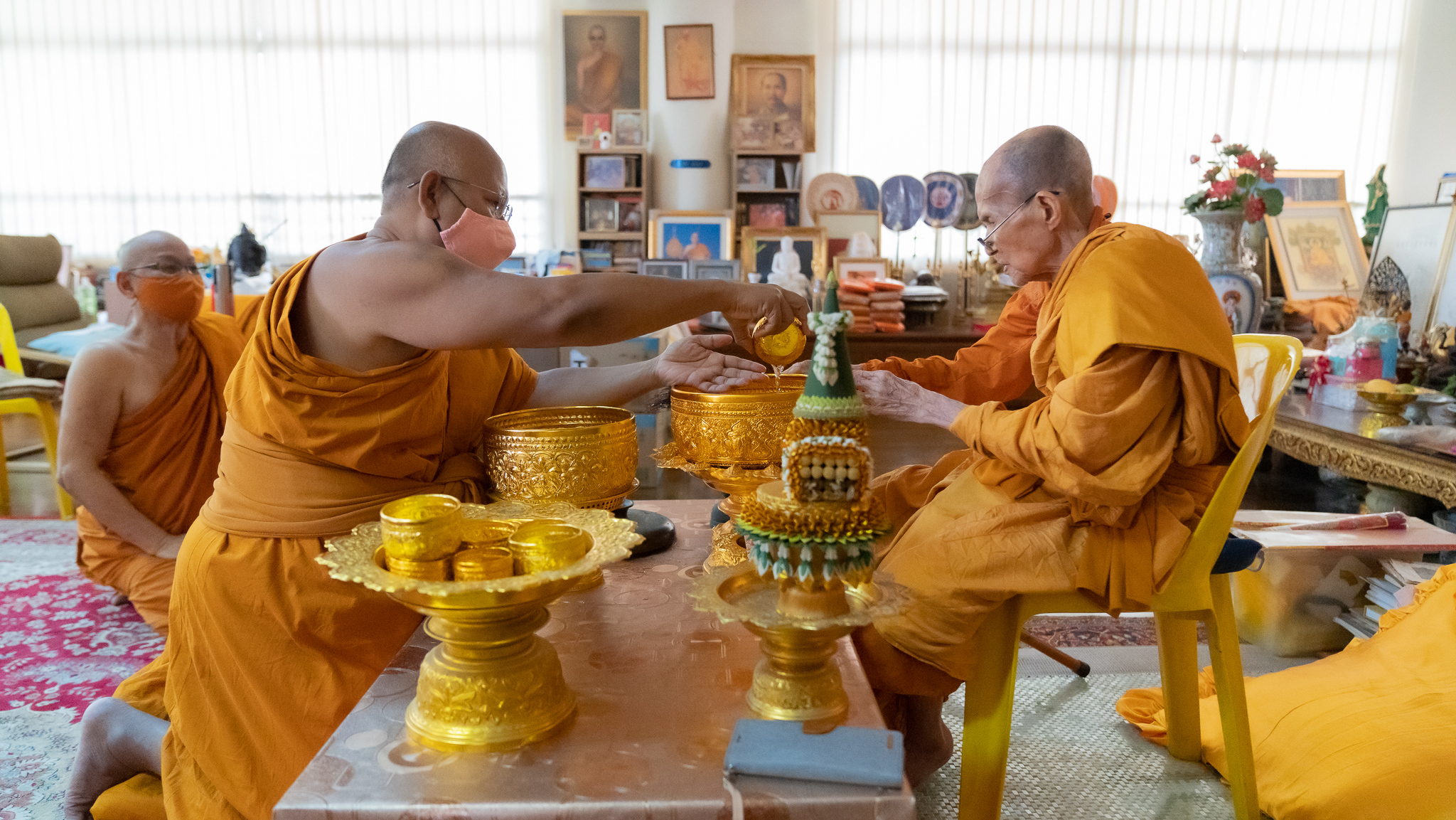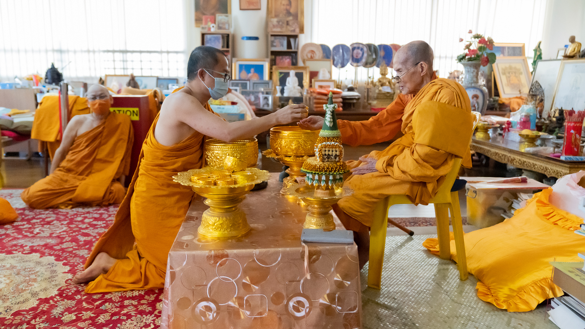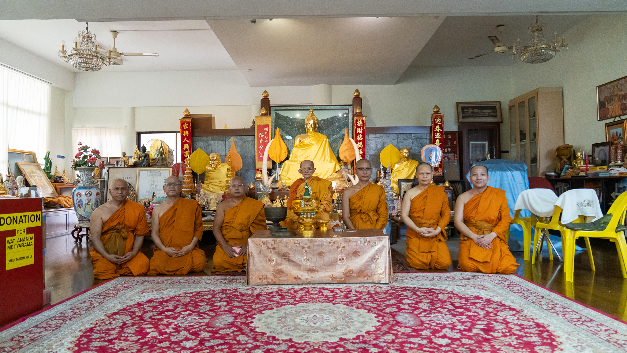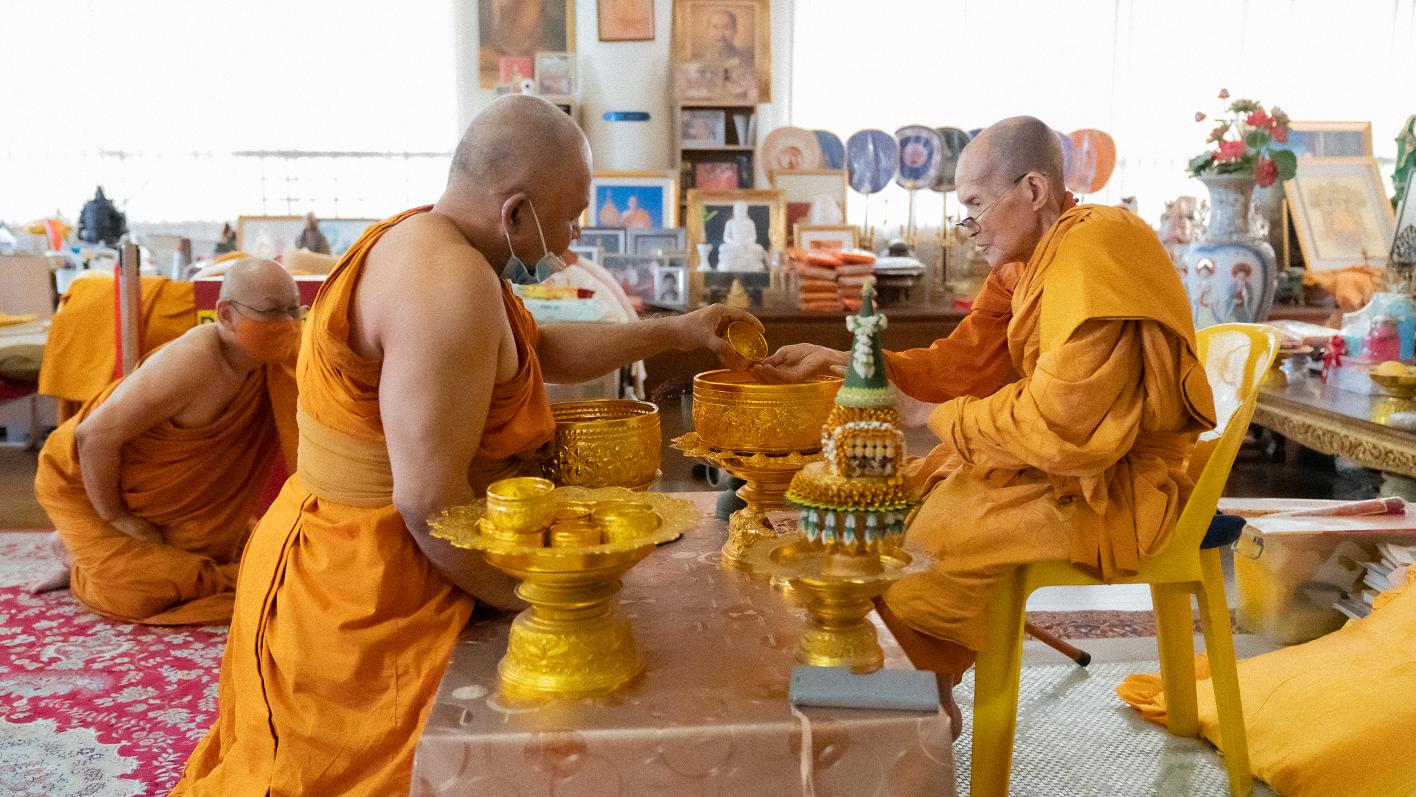 The resident monks of Wat Ananda Metyarama performed an action of showing respect to Most Venerable Luang Phor Chao Khun on special occasion of Songkran Festival Celebration (Thai New Year Celebration) 13 April 2022.