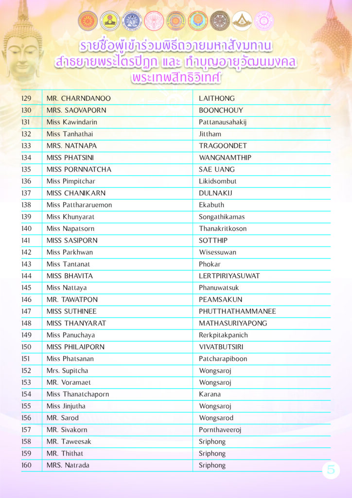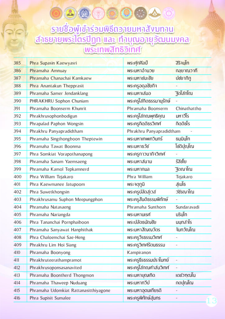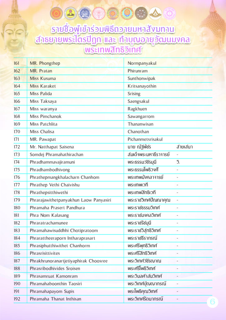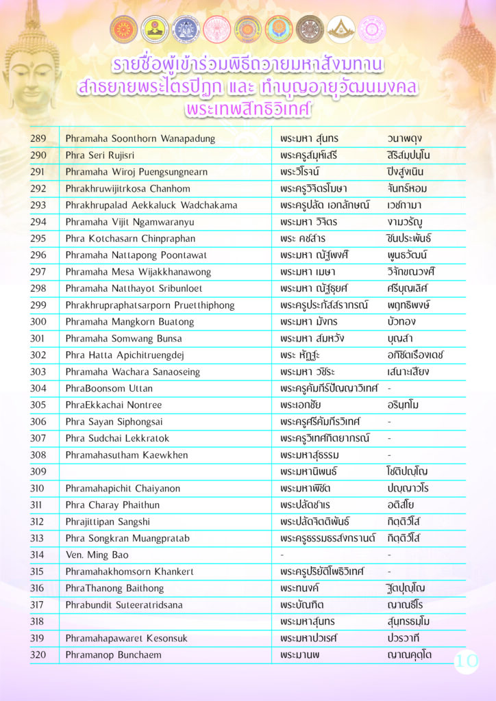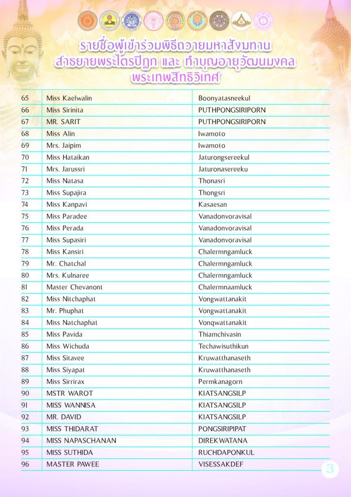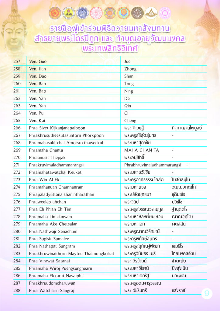 รายนามคณะพระเถรานุเถระและคณะอุบาสกอุบาสิกา ผู้ได้แจ้งความจำนงลงทะเบียนเข้าร่วมพิธีถวายมหาสังฆทานแด่พระภิกษุนานาชาติจำนวน ๓๐๐ รูป ณ หอประชุม Suntec Convention Center Hall 404 วันที่ ๑๓ พฤษภาคม พ.ศ. ๒๕๖๖ ตั้งแต่เวลา ๐๙.๐๐ น. เป็นต้นไป