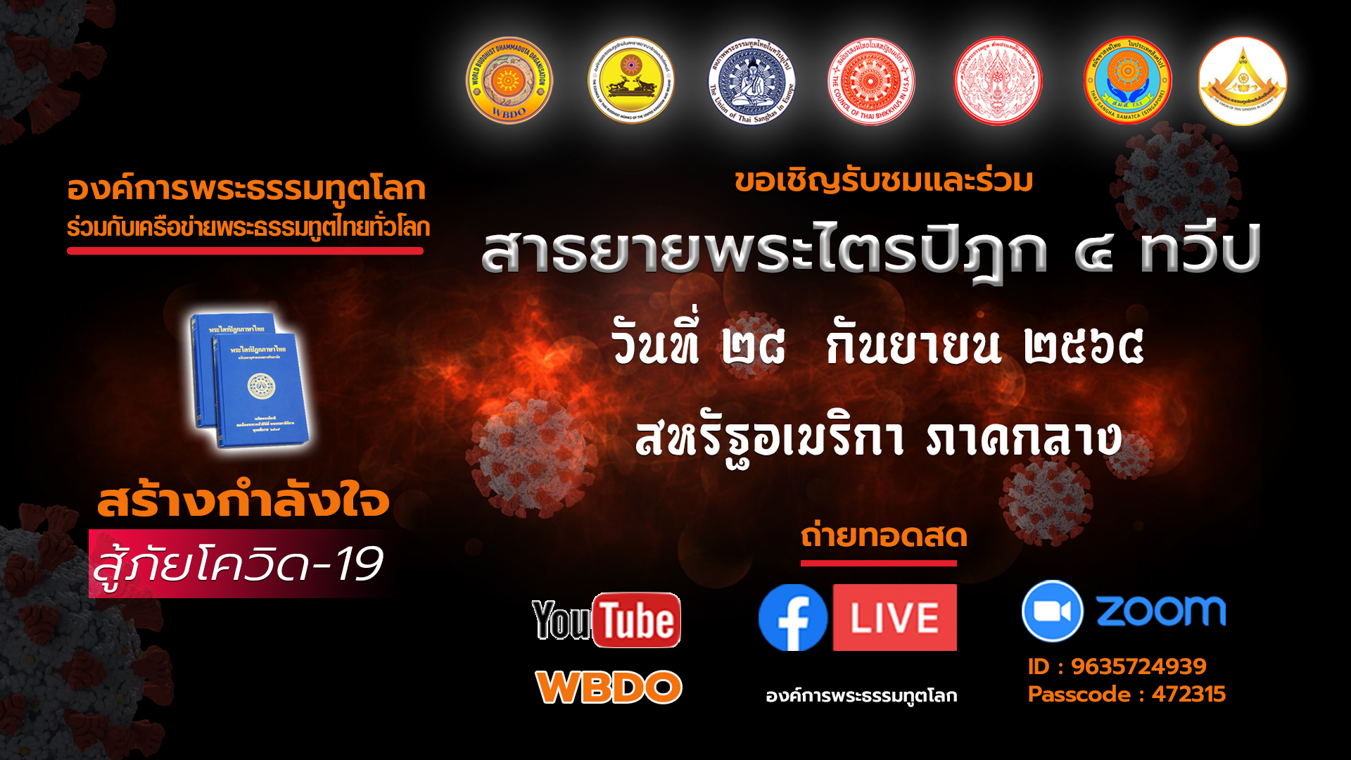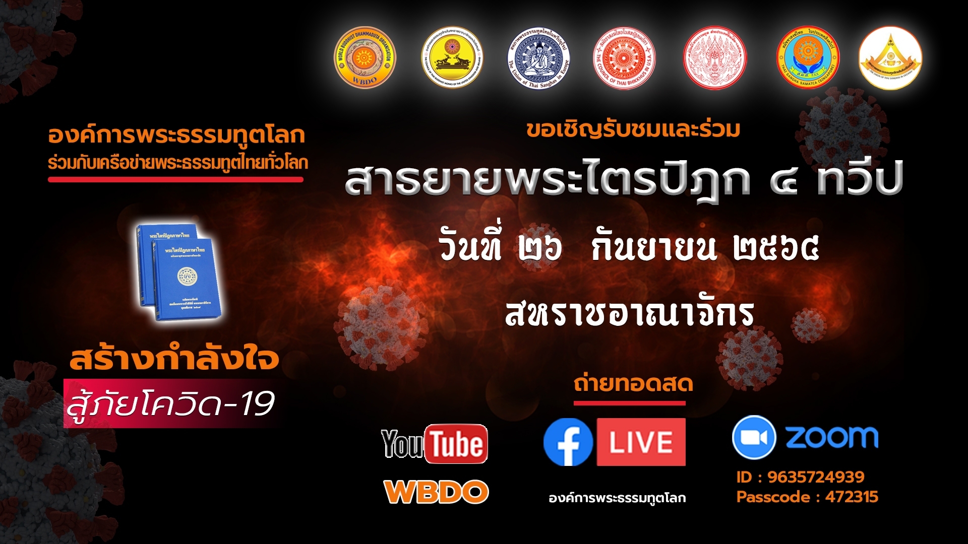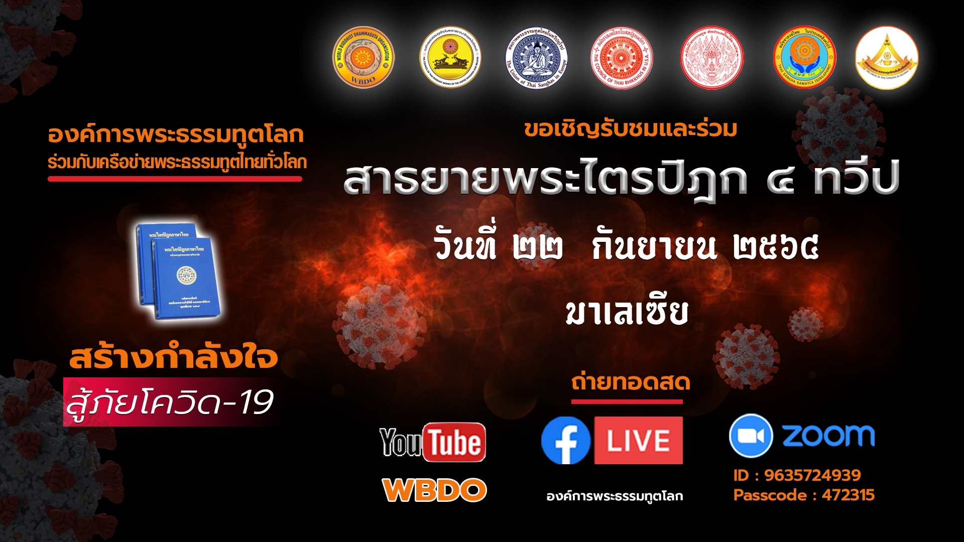 ครงการสาธยายพระไตรปิฎกออนไลน์ (Virtual Tipitaka Chanting) จัดขึ้นโดยความร่วมมือของพระธรรมทูตไทยในต่างประเทศทั่วโลก หรือ ในนามองค์การพระธรรมทูตโลก (WBDO- The World Buddhist Dhammaduta Organisation) เพื่อเสริมสร้างกำลังใจแด่สาธุชนผู้ที่กำลังประสบภัยคุกคามจากไวรัสโควิด-19 ที่สร้างความสูญเสียมากมาย โดยเฉพาะอย่างยิ่งกำลังแรงใจ องค์การฯ ได้เล็งเห็นว่า การสาธยายพุทธธรรมคำสอนของพระบรมศาสดาสัมมาสัมพุทธะนั้น จักช่วยบรรเทาความวิตกกังวล และเป็นการดำเนินตามรอยทางของพุทธองค์ที่ได้ประทานแนวทางไว้เมื่อครั้งพุทธกาล วิธีการดำเนินการสาธยายครั้งนี้ นับเป็นครั้งที่ 2 ต่อยอดจากปี พ.ศ.2563 โดยได้แบ่งโซน หรือ ภูมิภาคเป็นหลายส่วน เช่น พระธรรมทูตโซนอเมริกา พระธรรมทูตโซนยุโรป พระธรรมทูตโซนอังกฤษ พระธรรมทูตโซนโอซะเนีย พระธรรมทูตโซนประเทศอินเดีย-เนปาล พระธรรมทูตโซนประเทศสิงค์โปร พระธรรมทูตโซนประเทศมาเลเซีย และโซนอื่น ๆ ที่แจ้งความจำนงเข้าร่วมสาธยายครั้งนี้